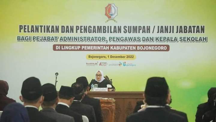 BOJONEGORO (RADARMADIUN.COM) – Bupati Bojonegoro Anna Mu’awanah melantik dan mengambil sumpah/janji jabatan sebanyak 52 pejabat. Mereka terdiri dari 10 pejabat administrator, 8 pengawas dan 34 kepala sekolah di lingkup Pemerintah Kabupaten Bojonegoro. Pelantikan digelar di Pendopo Malowopati Pemkab Bojonegoro, Kamis (1/12/2022).